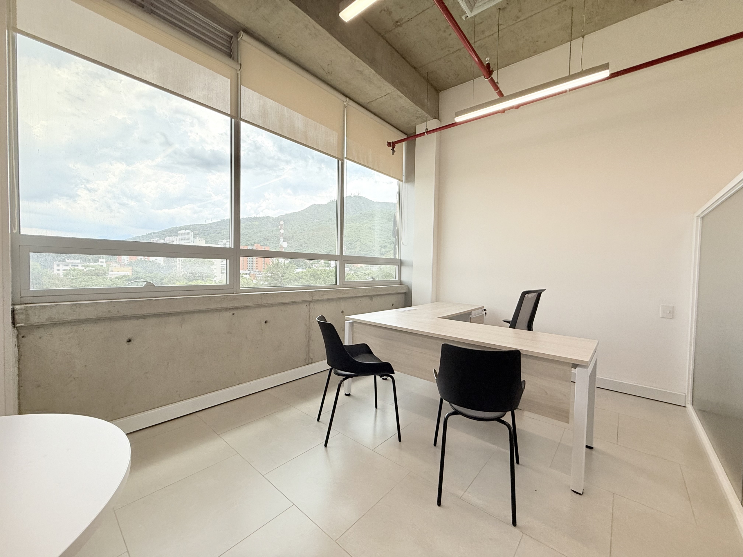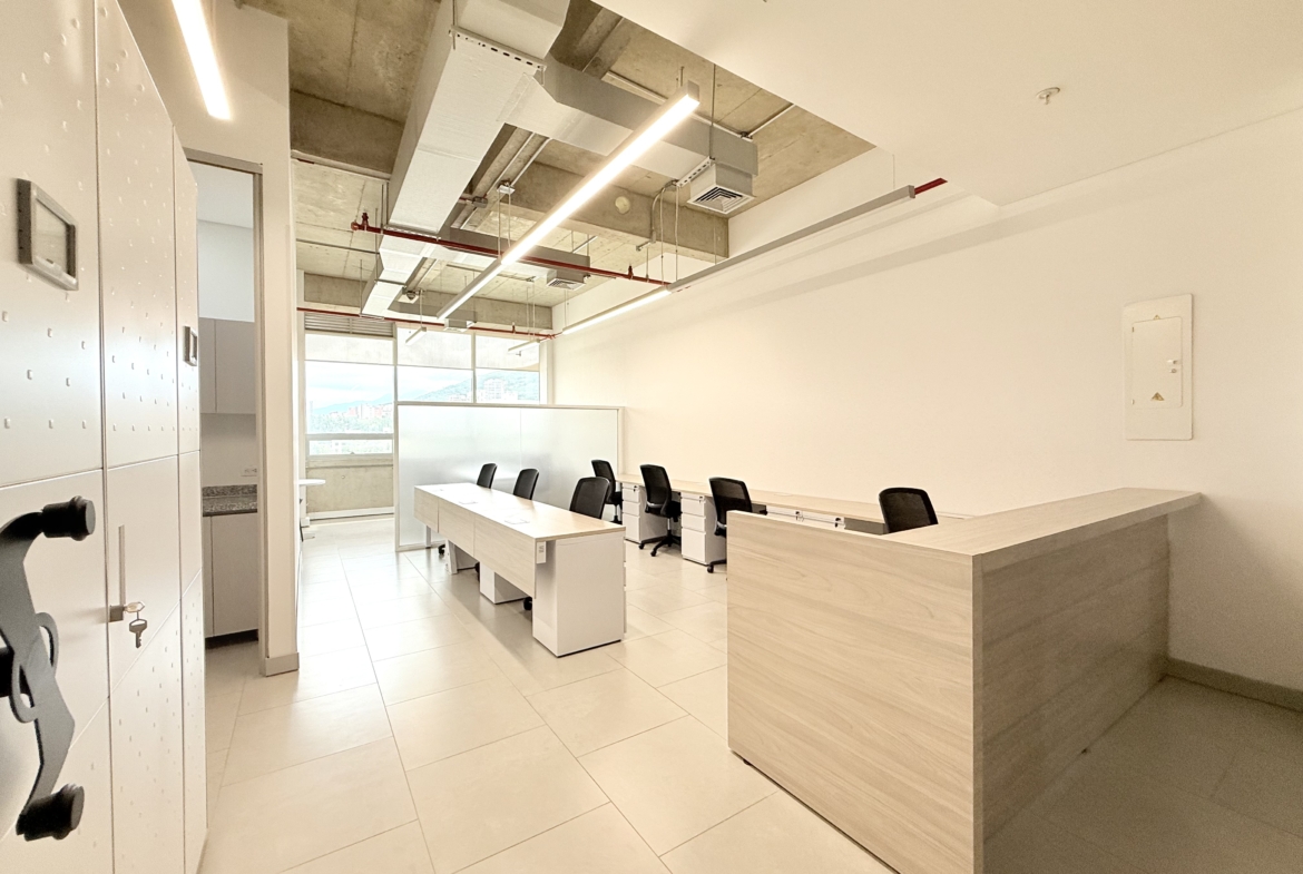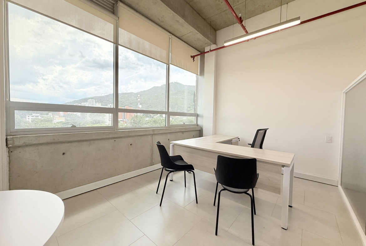 La oficina cuenta con 56 m² completamente amoblados y una distribución eficiente que incluye recepción, puestos de trabajo equipados, baño privado, cocineta funcional y archivo móvil. Dispone de aire acondicionado central, ventanería con aislamiento térmico-acústico y vista hacia los cerros de Cali, ofreciendo confort y entorno profesional.